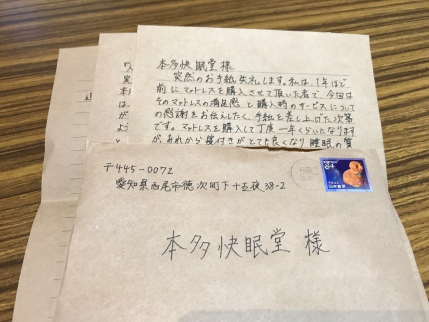 手紙には、便箋3枚に、睡眠の質が向上したことなどうれしいお言葉がいっぱい。