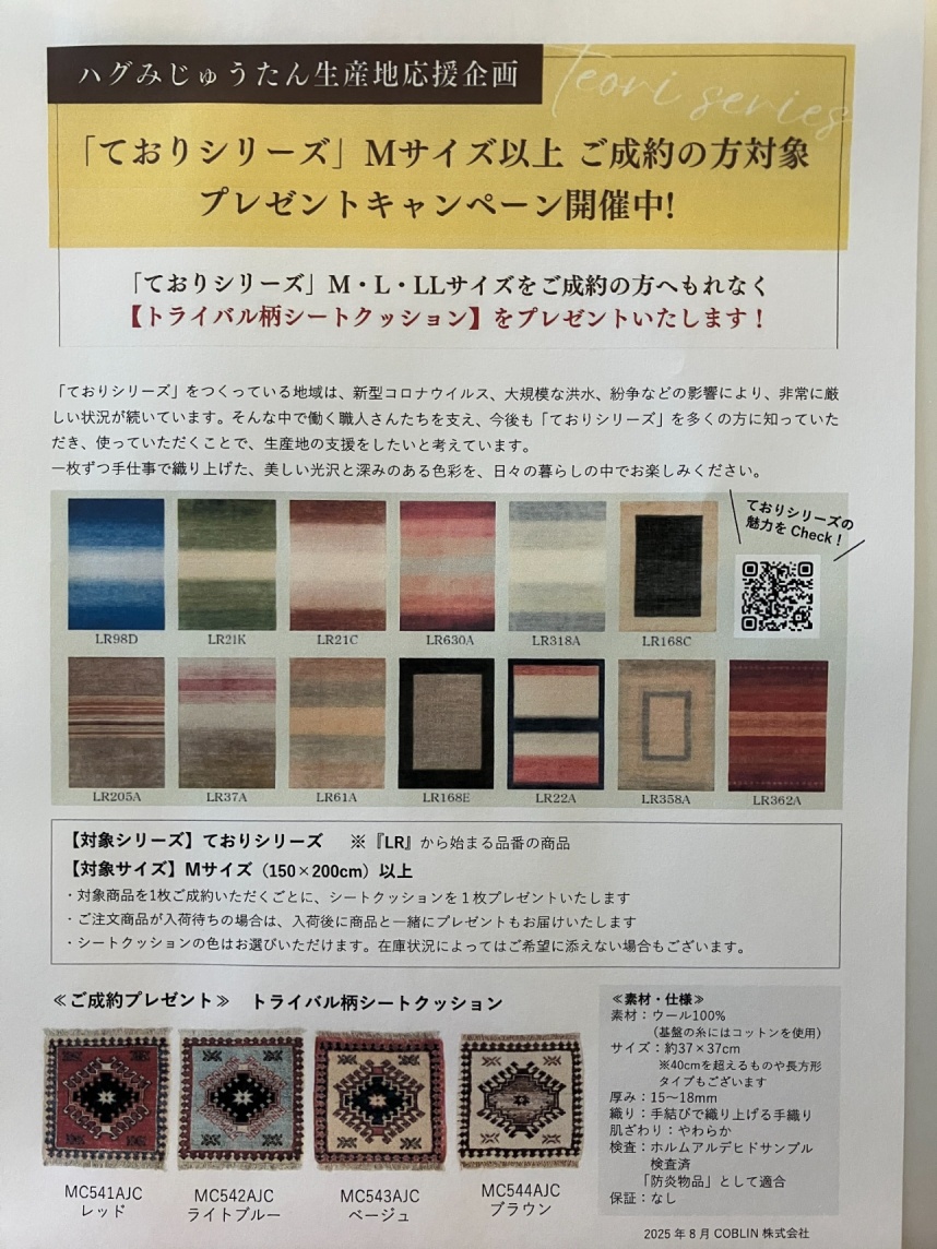 ハグみじゅうたん ておりシリーズ 購入でプレゼントキャンペーンを行っています。