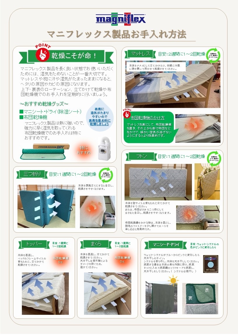 2022.04.18 NEWS マニフレックスのお手入れ方法 乾燥こそが命! マニフレックス製品を長く良い状態でお使いいただくためには、湿気をためないことが一番大切です。 マットレスや枕に湿気がたまったままになると、ヘタリやカビの原因になります。 上下・裏表のローテーション、立てかけて乾燥や布団乾燥機でのお手入れを定期的に行いましょう。 マットレス/三つ折り/フトン/トッパー/まくら/マニシート・ドライ など 詳しいメンテナンス方法は、下記 画像をご確認ください。