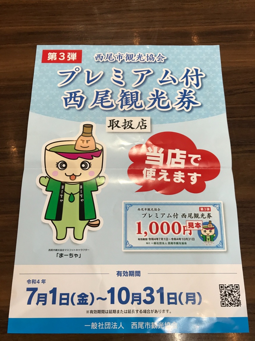 2022.06.19 NEWS プレミアム付き西尾観光券 【お知らせ】 応募された方は、そろそろ当選・落選の通知が届く頃でしょう。 今回は、応募多数のため、当たらなかった方も多いみたいです。 当選された方、おめでとうございます。 ちなみに我が家は、すべて落選でした。 家族そろって『運』の悪さを披露してしまいました。 ご使用期間は、7月からとなっております。 本多快眠堂でも使用できますので、ご利用ください。 商品だけでなく、布団の丸洗い・お直し等にも利用できます。 よろしくお願いします。