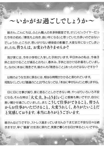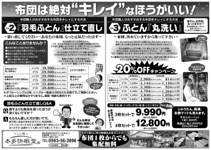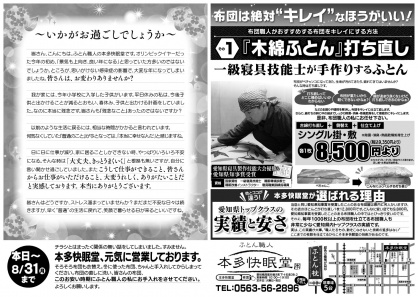 2020.06.28 SALE 職人のふとん 布団をキレイするキャンペーン チラシ 街も人や車が多くなってきました。 そろそろ本気で頑張ります! 本多快眠堂の お布団“キレイ”キャンペーンのチラシです。 ぜひこのお安い期間に皆さんの布団、 ふとん職人の本多快眠堂にキレイにさせてください。 ふとん職人 本多 直也 国家資格一級寝具製作技能士 寝具科職業訓練指導員 睡眠環境診断士 睡眠改善インストラクター 愛知県寝具製作技能競技大会 優勝 寝具製作愛知県知事賞受賞