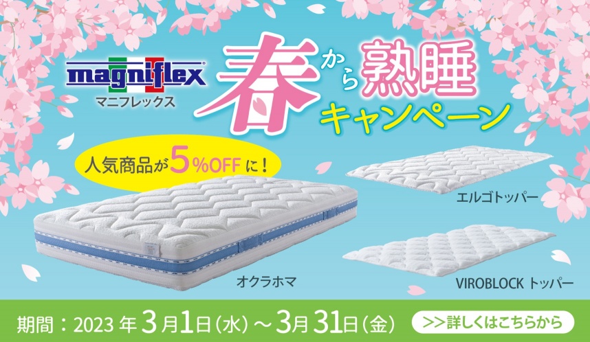 2023.03.01 SALE マニフレックス マニフレックスのキャンペーン 【マニフレックス 春 キャンペーン】 3月キャンペーンのお知らせです。 人気商品の「オクラホマ」「ヴィロブロック・トッパー」「エルゴトッパー」が ちょこっとだけお得になります。 絶対に値引きが無いマニフレックス。 このご時世、ちょこっとでも安いのは助かるよね。 この機会に、新生活ではないあなたも、 『眠り』について考えてみませんか? 本多快眠堂が、あなたにピッタリのベッドマットをご提案します。 期間は3月1日~31日まで ※キャンペーン、早期終了の場合もございます。ご了承ください。