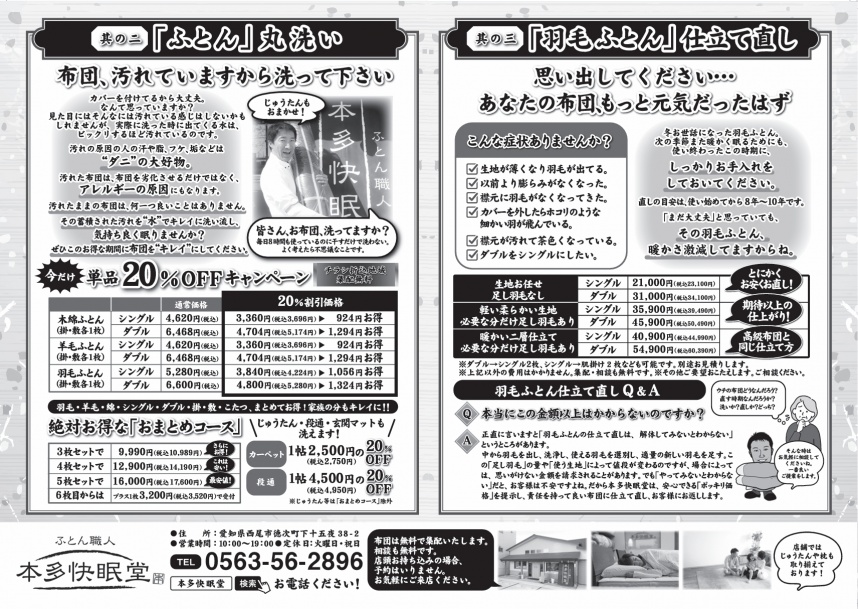 2025.07.13 SALE 布団を“キレイ”にするキャンペーン開催 夏の恒例! お布団をお安く『キレイ』にするキャンペーン開催です。 冬のお布団、使っていない今、しっかりお手入れをしてください。 物価高の今、お布団は、しっかりお手入れをして、長く使う。 これが賢い方法です。 新聞チラシ折込地域であれば集配無料です。 店頭持ち込みの場合は、予約等はいりません。 営業時間内にお持ちいただければ大丈夫です。