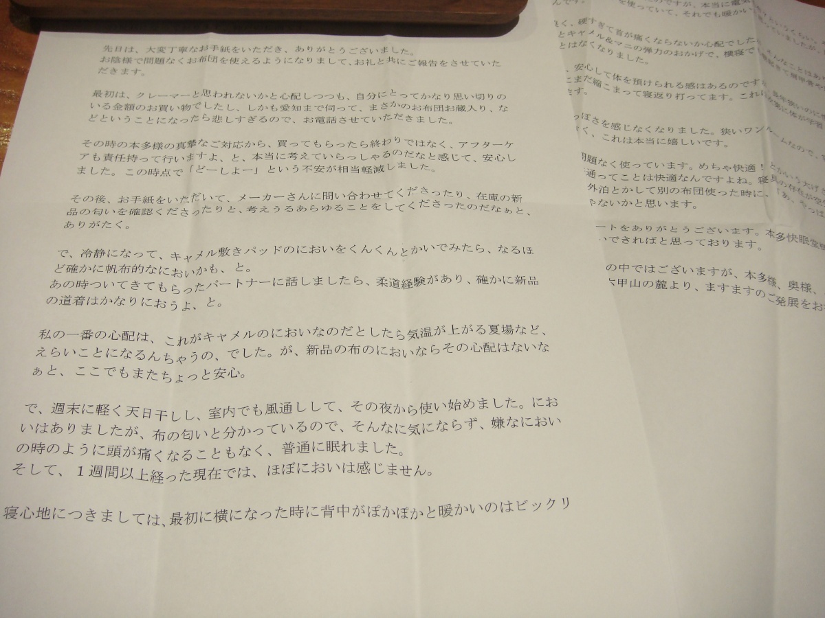 改めまして、全面的なサポートをありがとうございます。本多快眠堂様とも、このお布団とも、末永くお付き合いできればと思っております。
