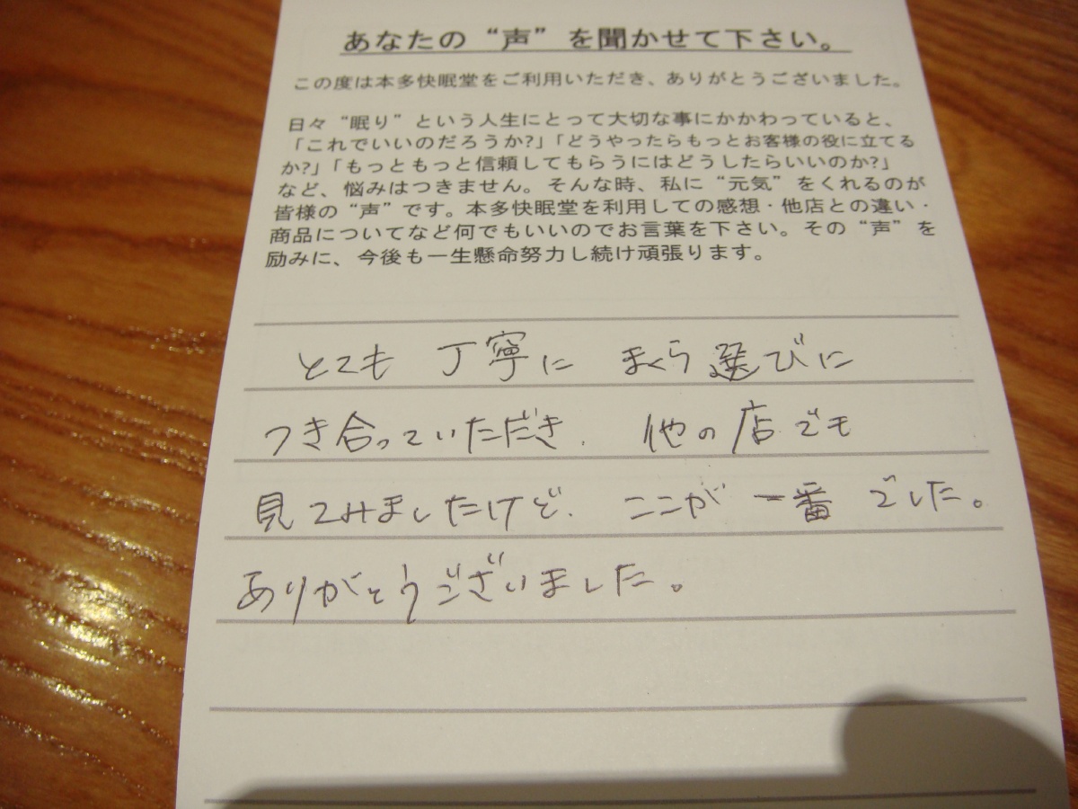 とても丁寧にまくら選びに付き合っていただき、他の店でも見てみましたけど、ここが一番でした。ありがとうございました。