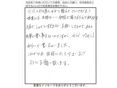 2019.01.29 F様 先日、敷布団のクリーニングをお願いしに初めて来店させて頂きました。 とても親切な対応で、色々と教えて頂けたので、とても頼りになるな~と思いました! これからもお世話になりたいと思いました。